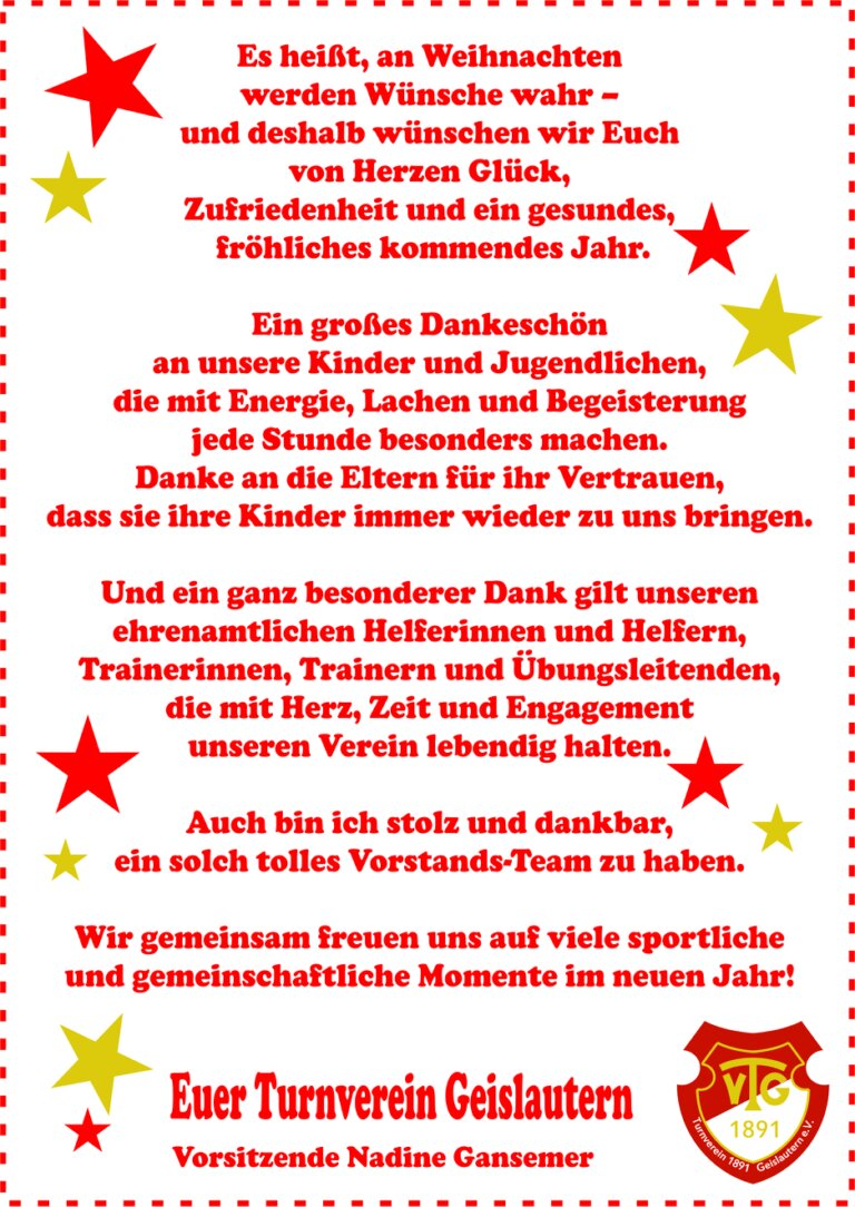 Ein herzliches Dankeschön an alle, die unseren Turnverein 1891 Geislautern e. V. im vergangenen Jahr begleitet und unterstützt haben. Dank eurer Unterstützung lebt und wächst unser Vereinsleben.